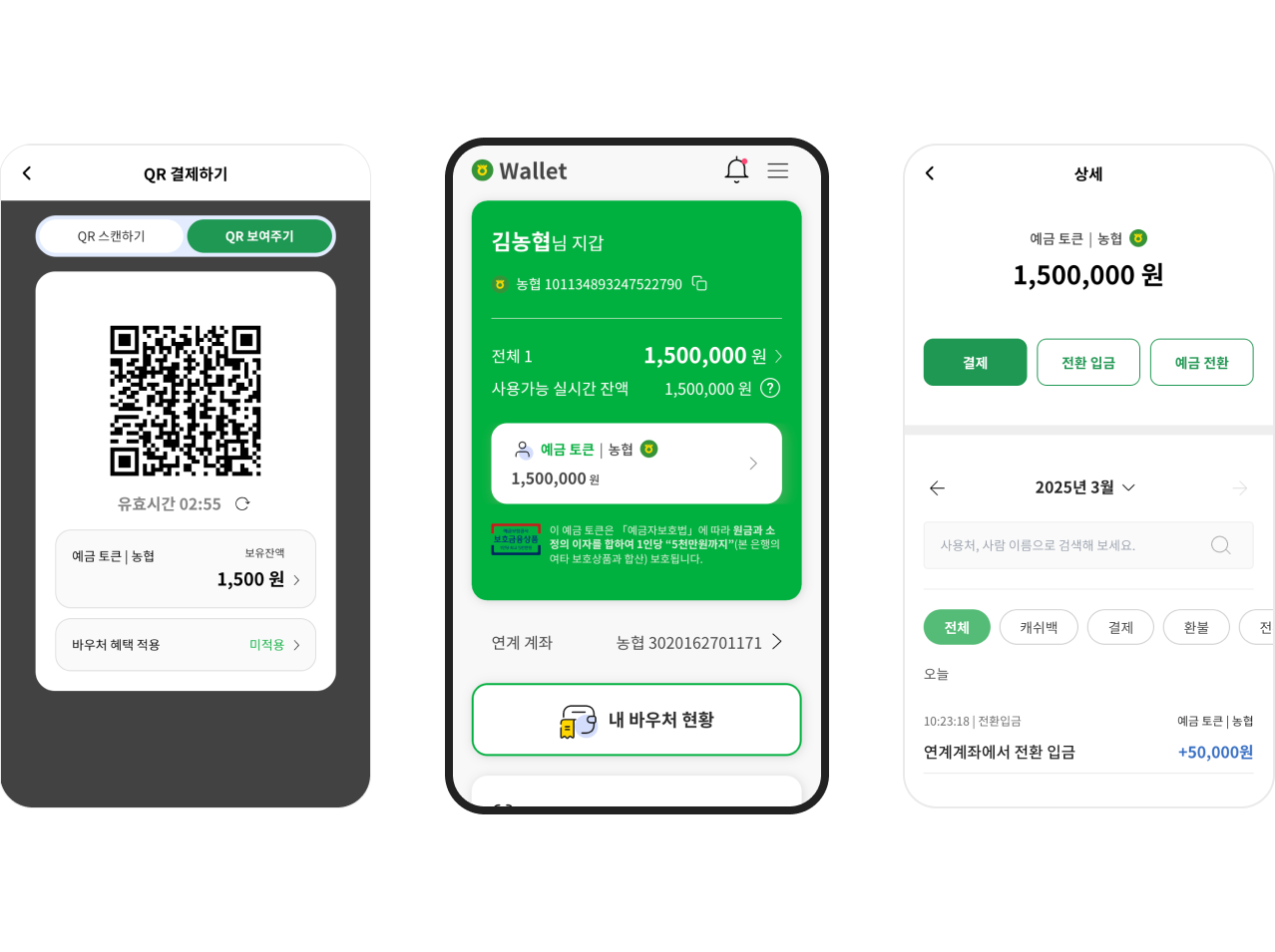 모바일 결제 수단 이용률이 70%에 달하는 요즘, 실물 화폐를 전자 토큰으로 1:1 대응한 예금 토큰을 차세대 결제 수단으로 사용함에 있어 검증하는 동시에, 기존 금융 결제 서비스와의 이질감 없는 UI와 자연스러운 사용성을 제공하도록 설계되었습니다. 마트·편의점 등 일상 속 다양한 가맹점에서 바우처와 캐시백 혜택을 편리하게 누릴 수 있으며, 새로운 서비스에 대한 학습 부담 없이 직관적인 인터페이스로 금융 거래를 이용할 수 있습니다.